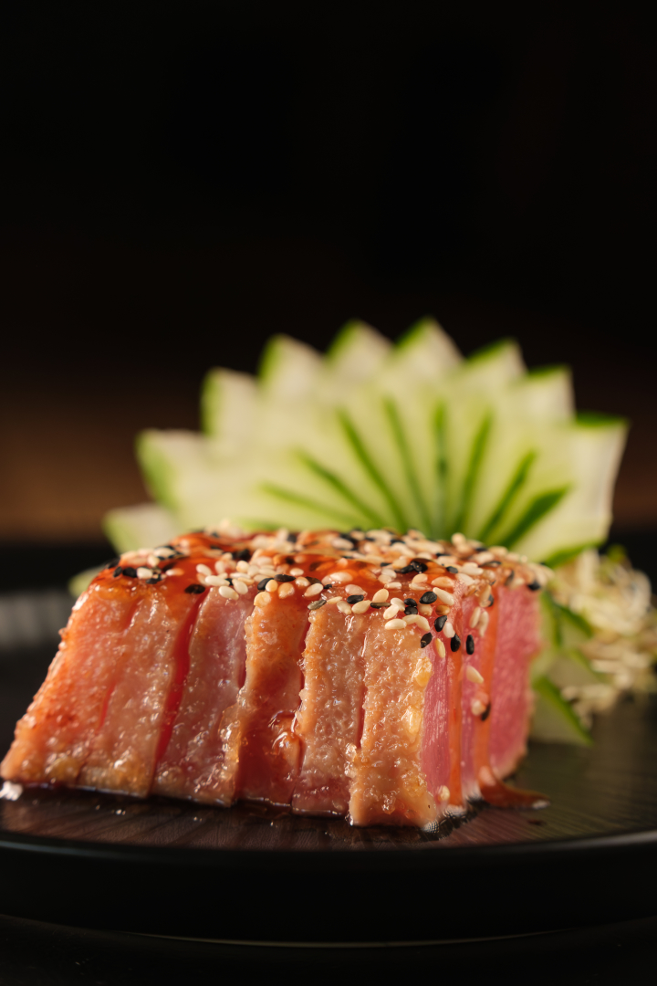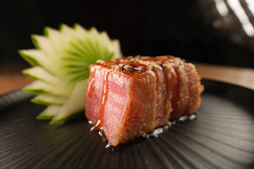 Sashimi de atum, selado com açucar demerara, gergelim torrado e pimenta siracha .06 unidades